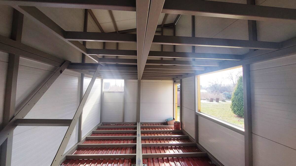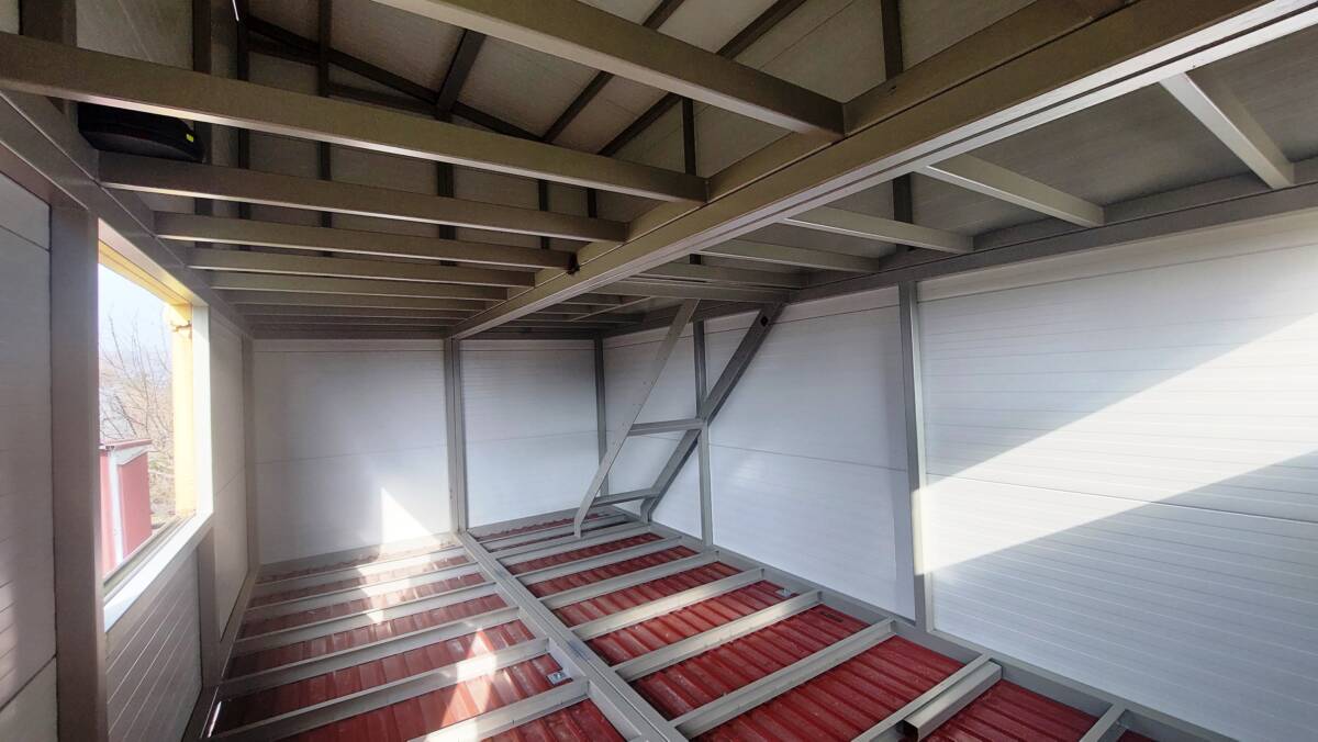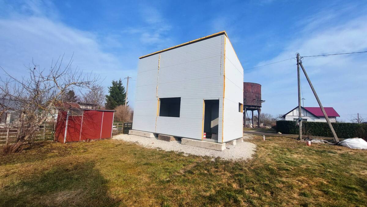 Установлен новый металлический каркас двухэтажного дома, общий метраж — 56 м2, в планах было строительство дома для круглогодичного проживания;