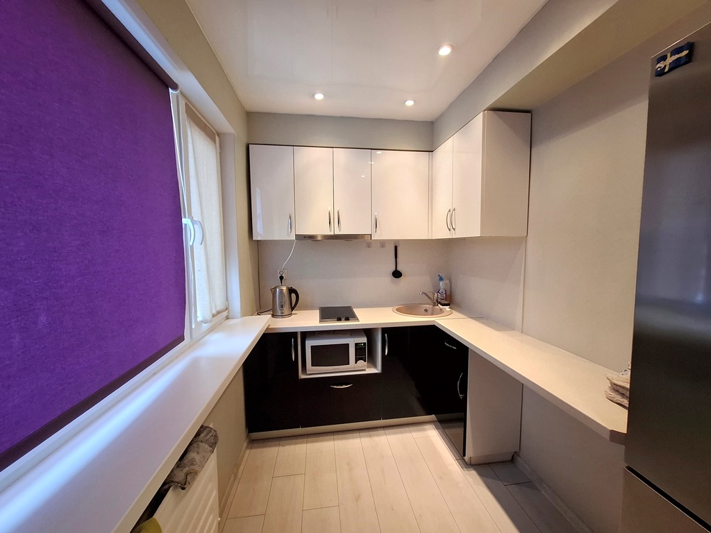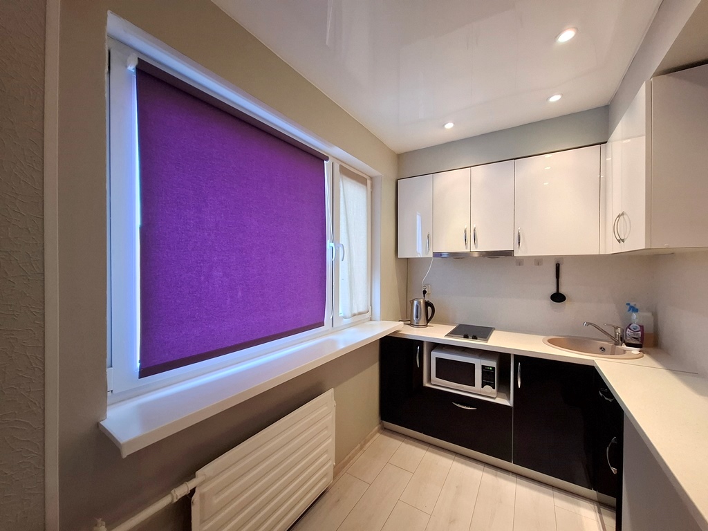Потолок: кухня, ванная, коридор- натяжной; комната-выровнен